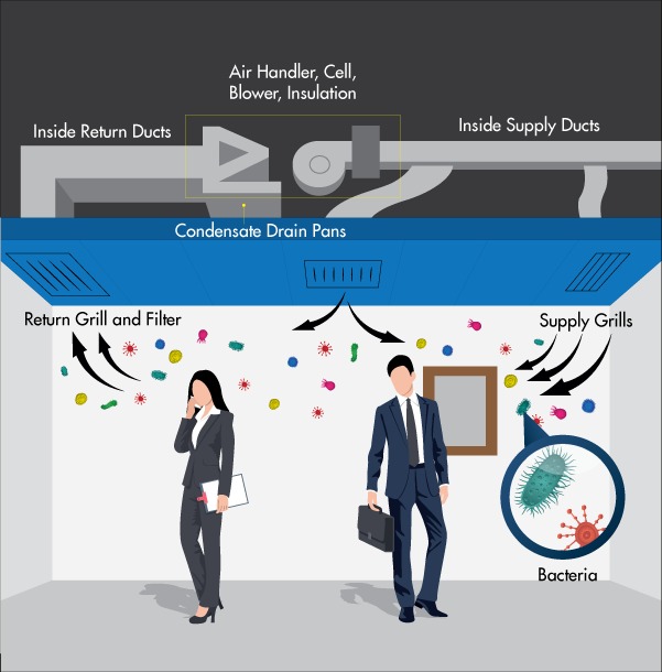 Standard cleaning methods do not reach deep inside the air-conditioning ducts, leaving hidden areas untreated and vulnerable to microbial buildup.